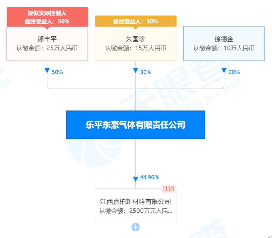 此外,还有一家江西嘉柏新材料有限公司(下称江西嘉柏),以前是乐平东豪持股44.96%的子公司,成立时间为2006年6月9日,目前天眼查显示该公司已注销。