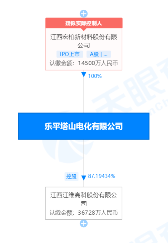 天眼查显示,江维高科由塔山电化持股87.19434%,而塔山电化则为另一家上市公司宏柏新材的全资子公司。
