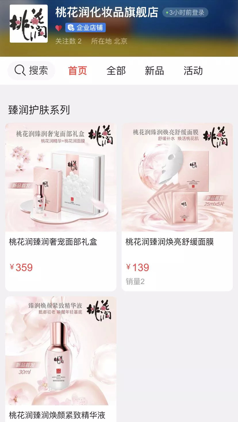 “桃花润首销是在线上销售。”桃花润微店客服称。青眼发现,目前桃花润的微店仅3个SKU在售,其中面膜售价69元,精华液售价169元、礼盒套装售价209元,其中,仅面膜售卖出2件。截至发稿,桃花润在天猫、京东等平台尚未开官方旗舰店。
