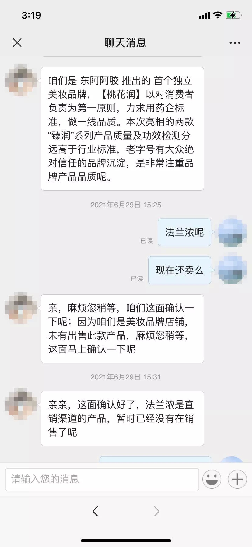 据悉,2017年,法兰浓阿胶营养保湿面膜正式发布,不过,自2019年9月30日开始,品牌在国家非特殊用途化妆品备案系统上就停止了产品备案上新。桃花润微店客服称,法兰浓自问世后,一直走的是直销渠道,目前产品已停止销售。