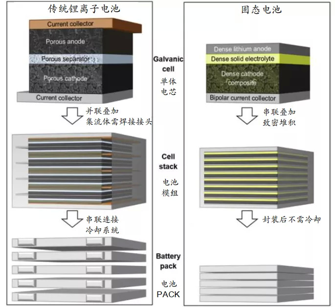 另外值得补充说明的是,液态锂电池往往需要先将单体电芯封装完成后先并联再串联,若想省流程直接串联,则会导致正负极短路。而固态电池由于内部不含液体,不存在短路的问题,可直接串联组装。还有,液态锂离子电池是需要冷却系统来防止其使用过程中温度过高。对于固态电池,因为其高安全性,可简化甚至不需要冷却系统。所以,固态电池的实际量产过程中,其成组成本会更低,整个生产流程更简单。