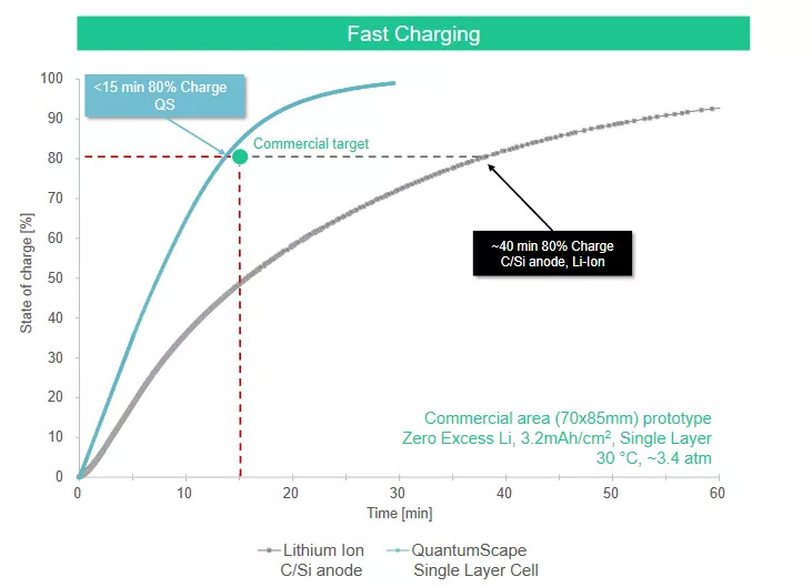 根据其官网公布的信息,QuantumScape已经在技术上突破固态电池离子电导率过低的瓶颈,快充速度甚至超过传统液态锂电池,快充15分钟实现充电80%,同时在能量密度、循环寿命、安全性方面,都显著优于现有的液态锂电池。