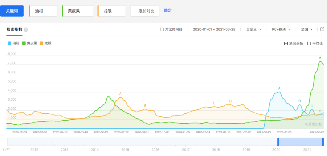 这是油柑、黄皮果、龙眼三种水果的百度指数对比,时间截取2020年1月到2021年6月: