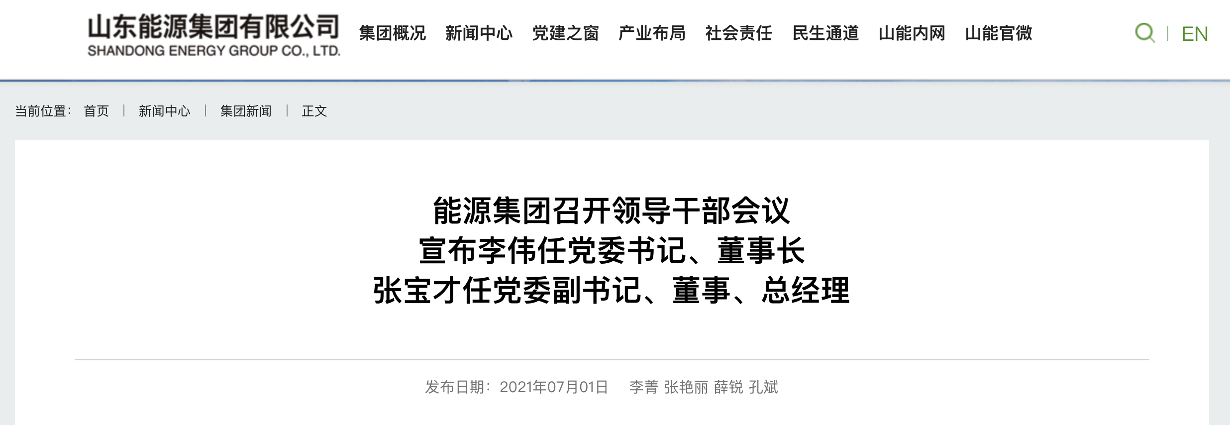 山东能源集团官网消息,6月29日上午,能源集团在济南召开领导干部会议,省委组织部分管日常工作的副部长于富华到会宣布省委关于山东能源集团领导班子调整的决定并讲话,满慎刚主持会议。省委决定:李伟同志任山东能源集团有限公司党委书记、董事长,张宝才同志任山东能源集团有限公司党委副书记、董事、总经理。因工作需要,满慎刚同志另有任用。