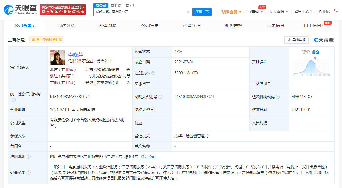 据天眼查APP显示,7月1日,成都光线动画有限公司成立,法定代表人李晓萍,注册资本5000万人民币,经营范围包括电影摄制服务;广播电视节目制作经营;电影发行;音像制品复制等。股东信息显示,该公司由北京光线影业有限公司全资持股。
