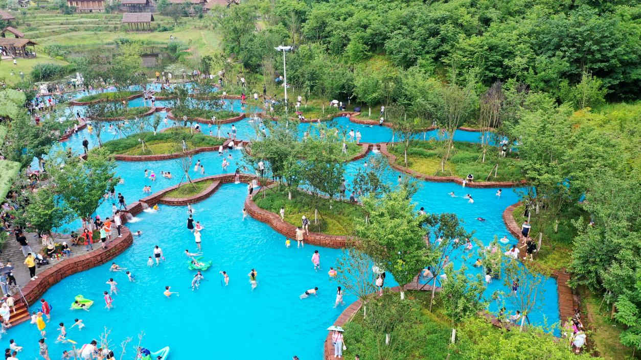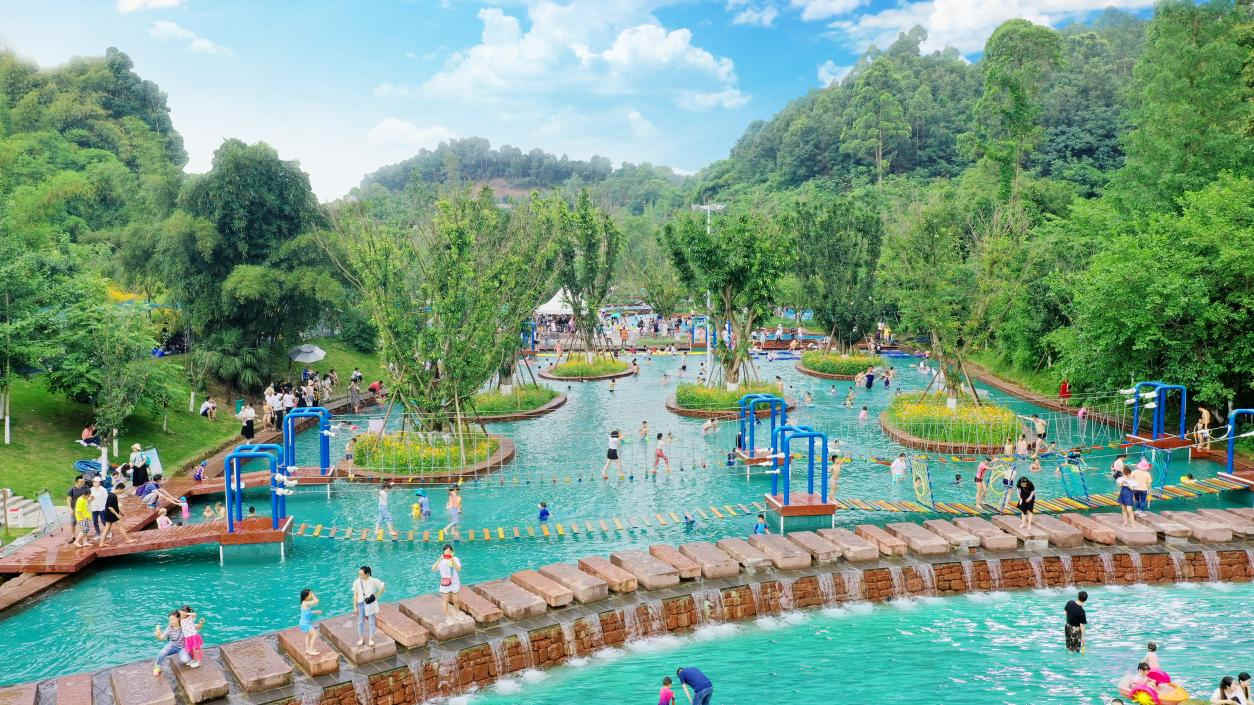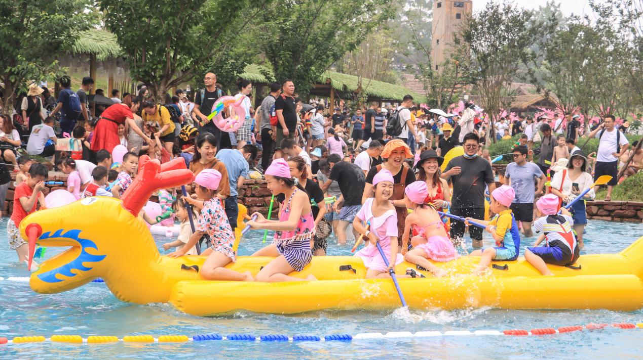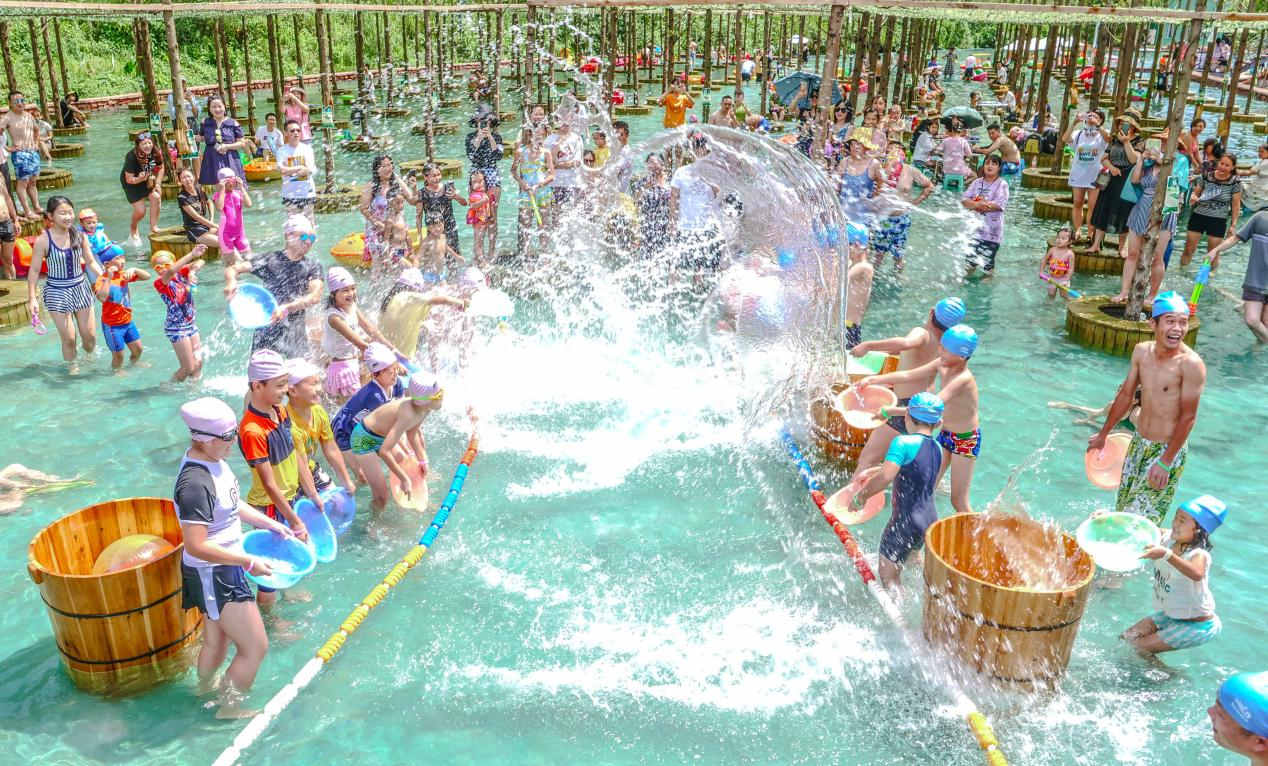 更有数十项游乐戏水项目,超多野趣新玩法。紫薇叠溪上的网红浮床、火烈鸟、小黄鸭,让你成为叠溪最靓的仔;还可以在榕树池划着网红玻璃漂流船,悠闲地荡漾在水面,好玩又出片;在桃花潭感受水上自行车;登上天梯,感受一跃入水的快感,水花四溅;玩累了就去水杉林,泡在清凉的水里,玩一局水上麻将,比比谁是真正的雀神。