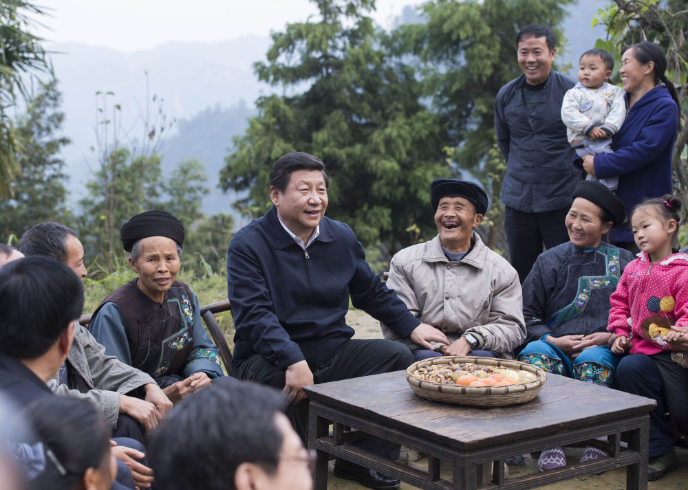 ↑2019年4月15日,习近平在重庆石柱土家族自治县中益乡华溪村同村民代表、基层干部、扶贫干部、乡村医生等围坐在一起,共话脱贫攻坚。