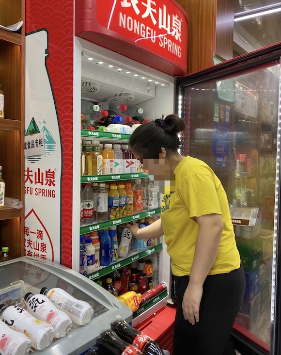 在上述北京南三环的那家烟酒店里,当界面新闻以消费者身份询问店主,将元气森林产品放入农夫山泉冷柜的做法是否得到农夫山泉业务员的允许时,店主立即将元气森林从冷柜中悉数取出,放入一旁厢式冷柜中。其称,农夫山泉的业务员会定期检查,但最近并没有来检查。