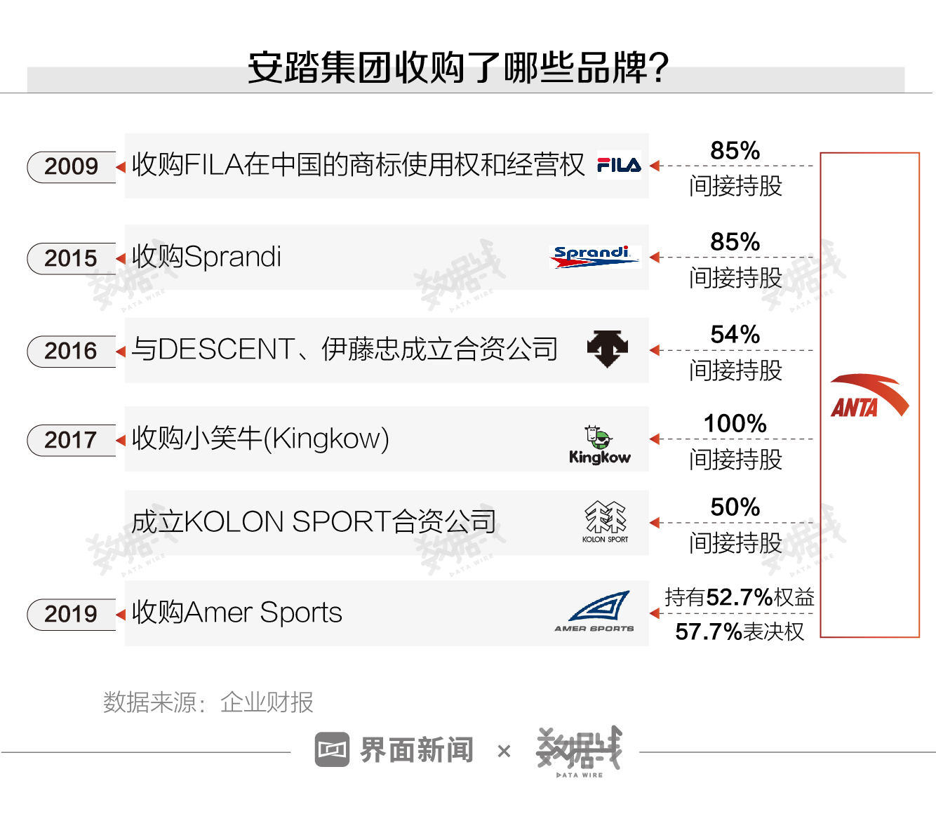 安踏集团的收购战略是业绩大涨的关键。2015年至2019年,安踏集团5年内以收购、成立合资公司等方式将4个运动品牌及体育巨头公司Amer Sports(亚玛芬)纳入旗下。