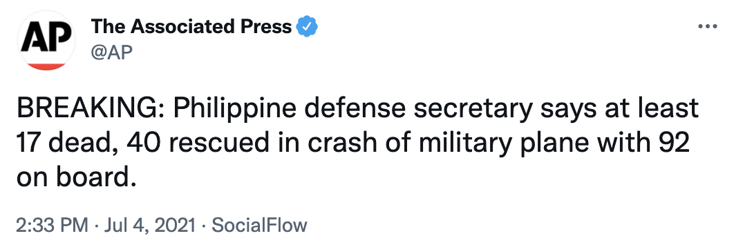 据美联社7月4日报道,菲律宾国防部长表示,一架军用飞机坠毁,机上载有92人,造成至少17人死亡,已有40人获救。