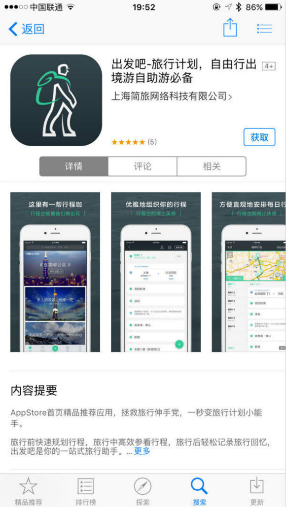 说走就走的旅行往往是一件看上去很美好实际上却要操很多心的事,出发吧没有很多花哨的图片,也没有大段的文字介绍,所有内容都基于你的组织方式产生,呈现最直接有用的信息。所以如果你并没有什么长远的旅行计划又突发奇想要出去走走,出发吧是个好选择。