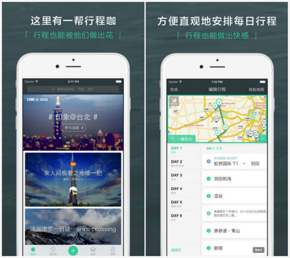 出发吧是一款获得过 AppStore 首页精品推荐的应用,专为拯救那些梦想着说走就走但事前毫无准备的旅行伸手党们。其中精选了各路旅行达人的优质行程,并提供一键复制功能,行程也会对照地图调整,优化路线; 内置导航、提醒、天气、清单、记账,简约设计,贴心实用。