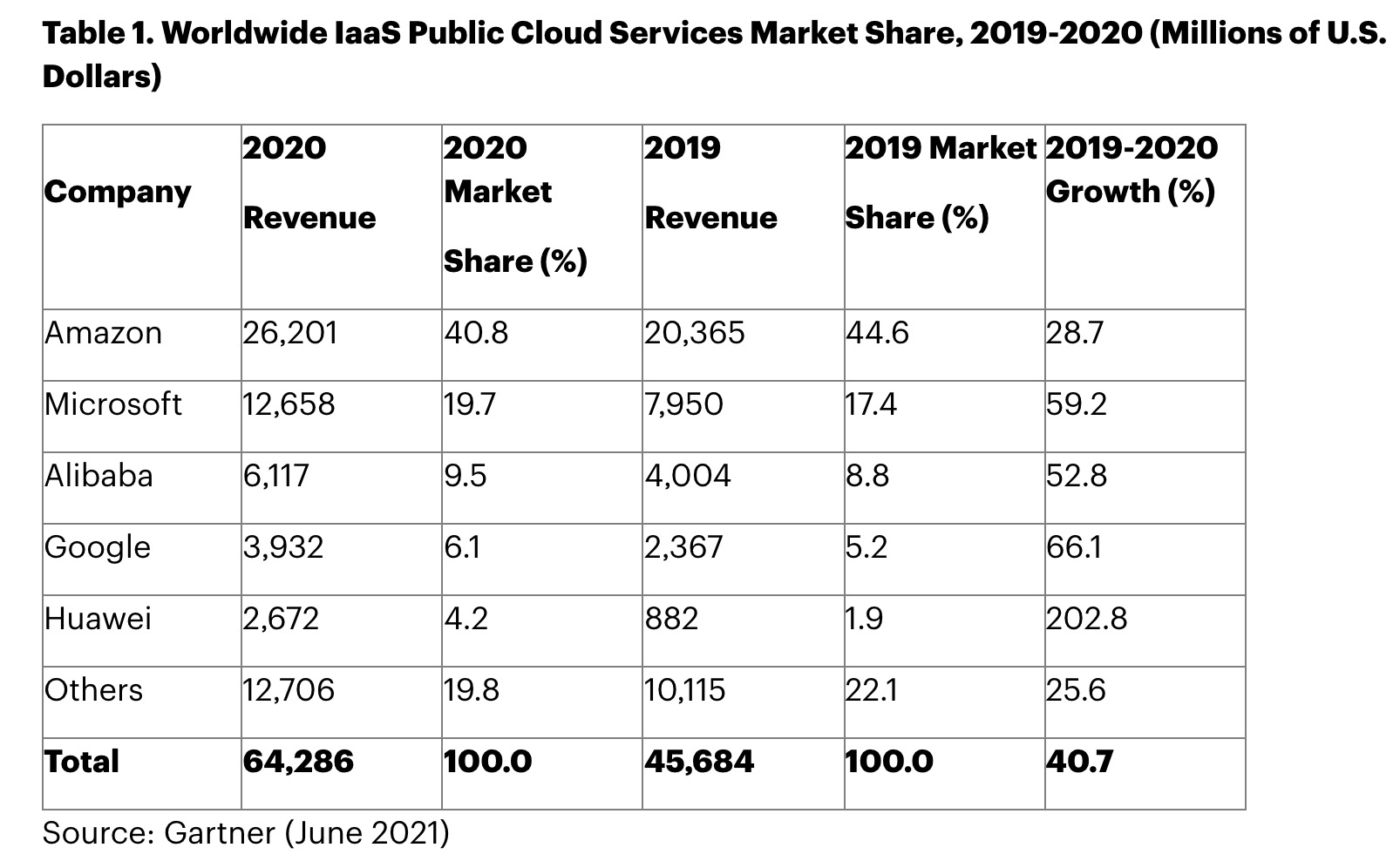 需要指出的是,面向企业服务方向,云服务已成为重要发展方向,将5G、物联网、人工智能等新技术透过云端输出,赋能全社会数字化转型,继而带来了华为云呈现高速发展,并实现了对腾讯超越。根据权威调研机构Gartner日前所发布的报告显示,在公有云IaaS市场中,2020年,华为云凭借27亿美元的收入首次跻身IaaS供应商前五,全球市场份额为4.2%。且这是是连续第二年增长超过200%。