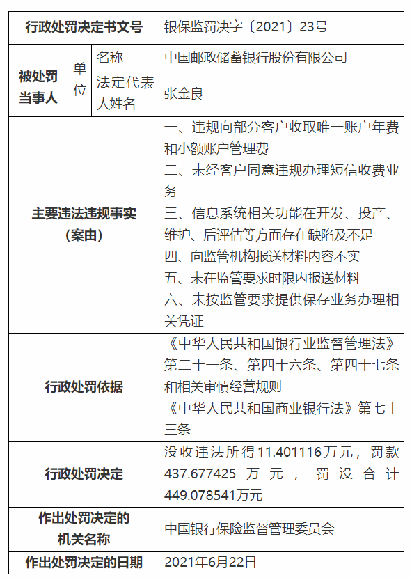 7月5日消息,据中国银行保险监督管理委员会行政处罚信息公开表,中国邮政储蓄银行股份有限公司存在以下主要违法违规事实:一、违规向部分客户收取唯一账户年费和小额账户管理费;二、未经客户同意违规办理短信收费业务;三、信息系统相关功能在开发、投产、维护、后评估等方面存在缺陷及不足;四、向监管机构报送材料内容不实;五、未在监管要求时限内报送材料;六、未按监管要求提供保存业务办理相关凭证。