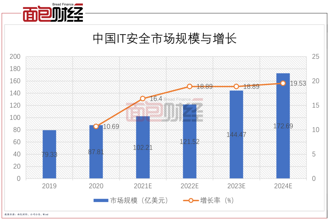 从行业来看,中国网络安全市场虽然起步较晚,但在多方面因素驱动下,其发展较快。根据IDC数据,2019年我国网络安全市场规模达到79.33亿美元,受疫情因素影响预计2020年增长至87.81亿美元,增幅为10.69%,增速有所放缓;随着网络安全政策法规持续完善优化,网络安全市场规范性逐步提升,政企客户在网络安全产品和服务上的投入稳步增长,预计到2024年我国网络安全市场将达到172.69亿美元。