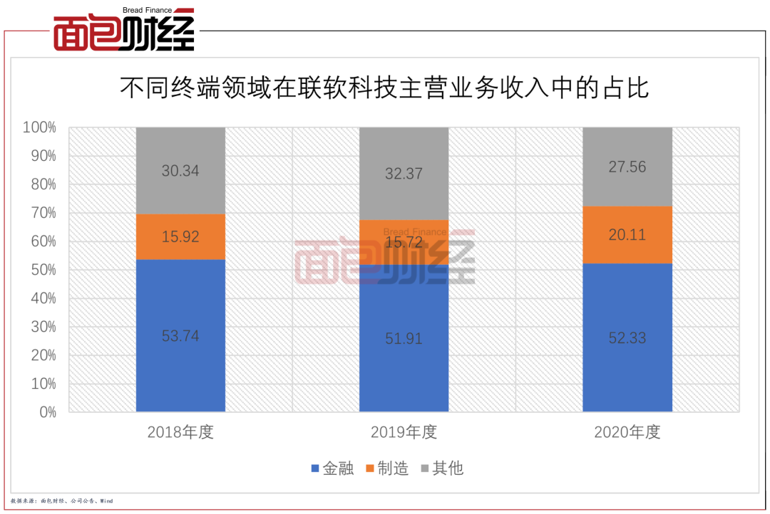 2018-2020年,联软科技金融领域收入分别为5001.54万元、7168.23万元和11968.61万元,占主营业务收入的比例分别为53.74%、51.91%和52.33%。