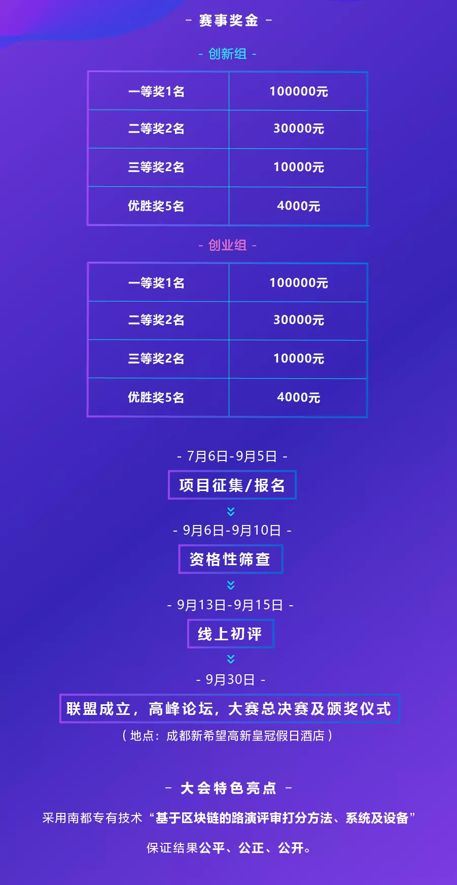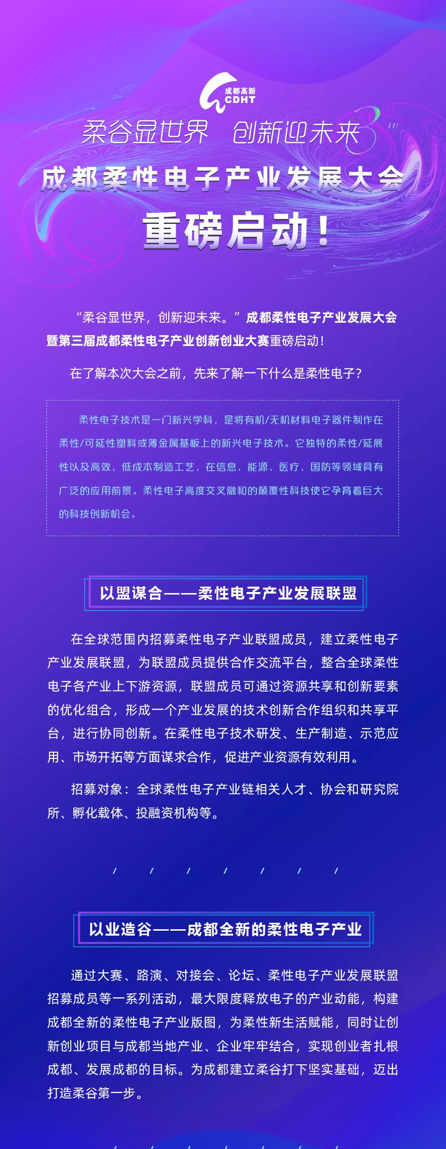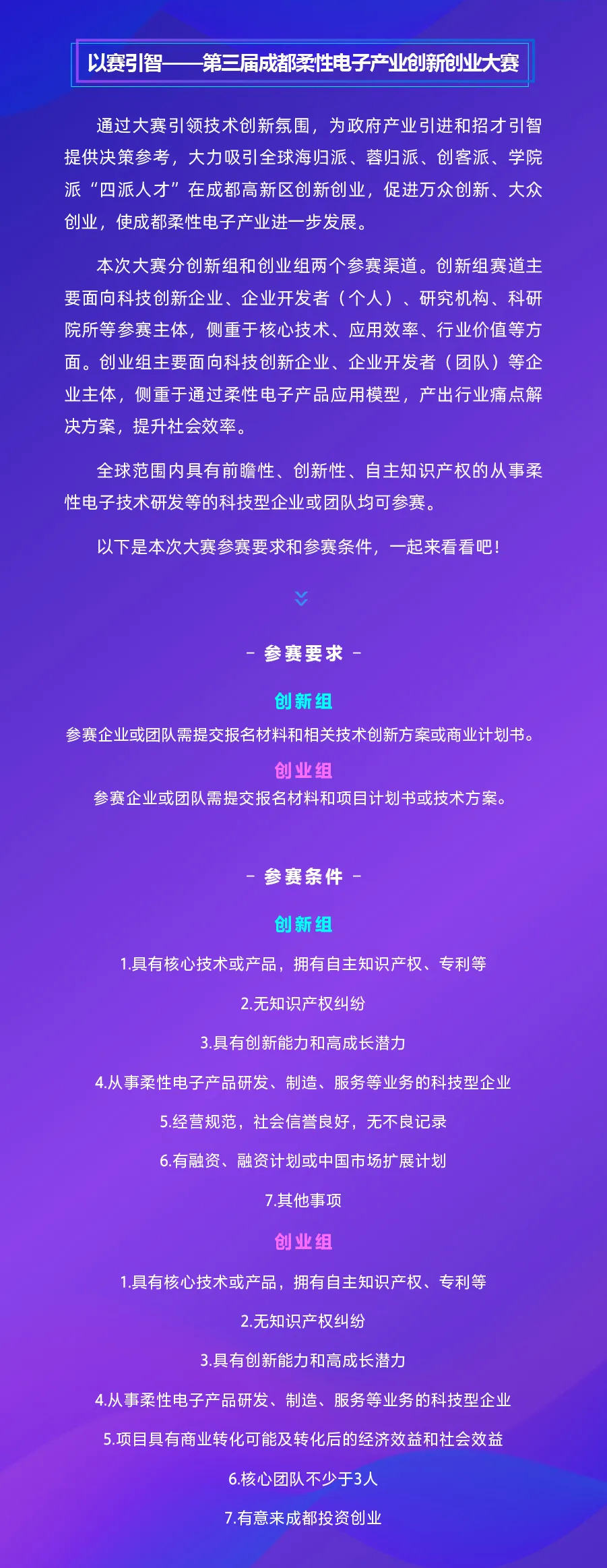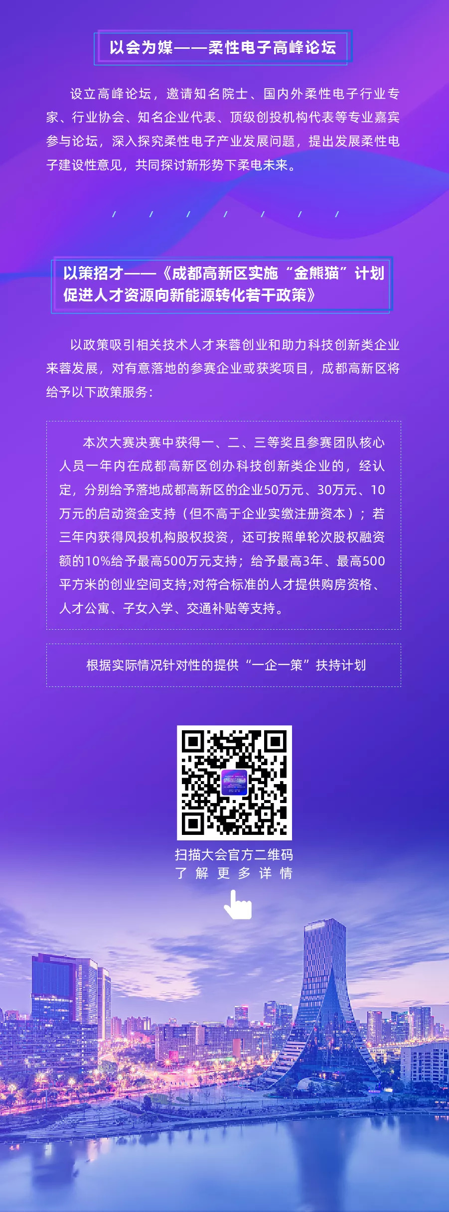 通过大赛引领技术创新氛围,为政府产业引进和招才引智提供决策参考,大力吸引全国海归派、蓉归派、创客派、学院派“四派人才”在成都高新区创新创业,促进万众创新、大众创业,使成都柔性电子产业进一步发展。