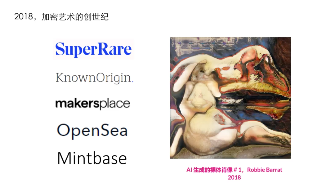 到了2018年,加密艺术开始进入了爆发期,出现了我们称为五大平台。SuperRare、KnownOrigin、Makersplace,我们现在称为三大加密艺术平台,都是2018年诞生的。然后出现了两个通用性的NFT的发行平台,OpenSea和Mintbase这两个项目。2018年是加密艺术行业非常非常重要的一年,出现了两大NFT的发行平台,又出现了三大加密艺术的交易平台,同时又出现了一批著名的,现在还比较知名的加密艺术头部艺术家。