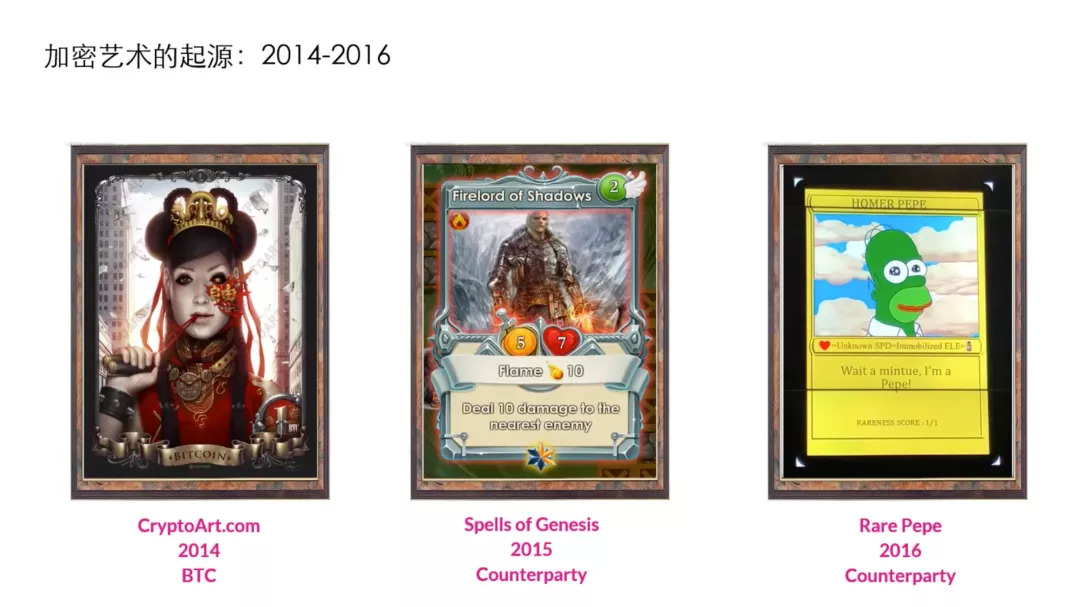 到2015年的时候,随着那时候有一个叫CounterParty的技术火了之后,它其实就是比特币的策略,出现之后就一有批公司基于CounterParty这个公司的出的比特币侧链技术,做了一批上面可以去发行类智能合约,早期具有部分智能合约功能的这些比特币侧链。像第一个跟加密艺术有关的一个项目叫SOG, Spells of Genesis,我们称为是创世魔法。