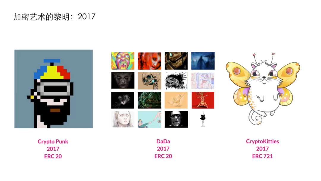 在2017年的时候他们就决定把这些头像放到以太坊上去,他们就把每一个头像发了一个ERC20的代币,去进行代币的销售。所以每个头像就是一个代币,那时候大家注意,还没有出现NFT的概念,每一个头像就是一个币。到了2017年的年底,CryptoKitty出现了。CryptoKitty是什么东西呢?就是我们称为加密猫,最左边的这个加密猫。它是一个叫做Dapp实验室,Dapp Labs这个团队基于以太坊的他自己发明的一个代币标准叫做ERC721标准,把Kitty就是可爱的小猫咪搬上了链,每一个小猫咪做成了一个NFT。自从NFT的资产格式标准出现,加密艺术就开始正式的登上历史舞台。