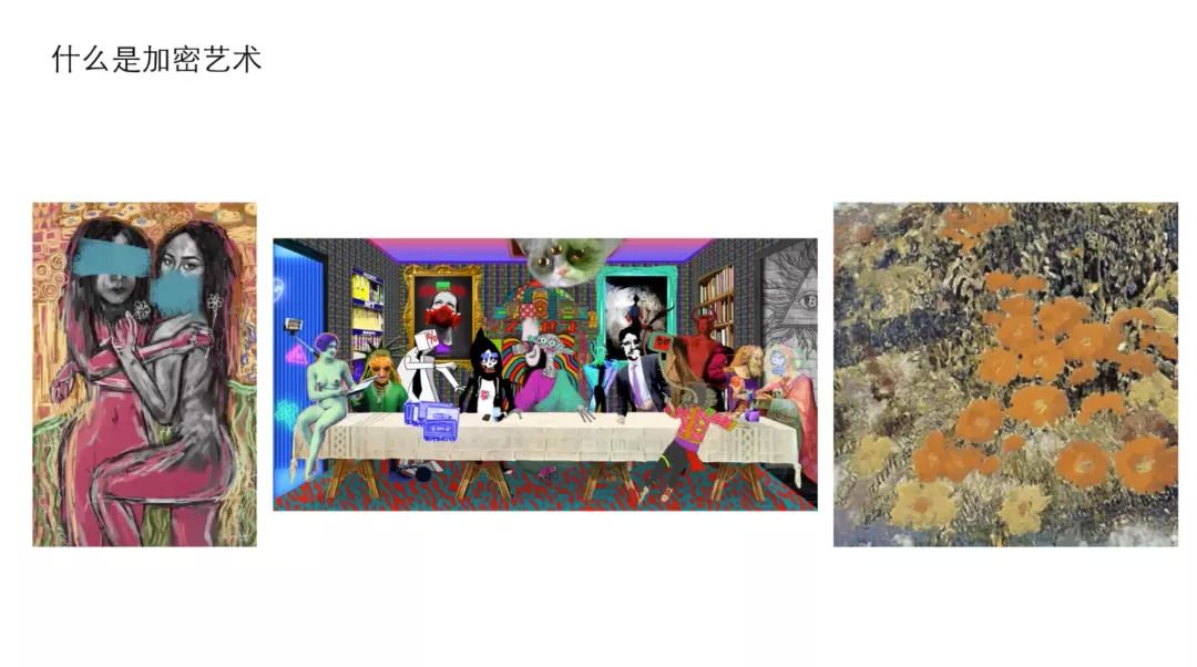 第二,是用加密的工具来进行创作。比如说智能合约,这里展示的当中的一幅画,它应该说是加密艺术史上具有相当重要里程碑作用的一幅作品,它叫做《First Supper》(第一顿晚餐),里面就是由十几幅涂层以智能合约的方式来进行交互,最后来完成拍卖。这幅作品非常非常知名,未来我相信就算百年之后,艺术史上都会提到这幅作品。那就是用加密的就是智能合约,用以太坊来进行创作、来进行拍卖的这样一件作品,我们称为第二个要素或者说条件,就是用区块链工具来进行创作。