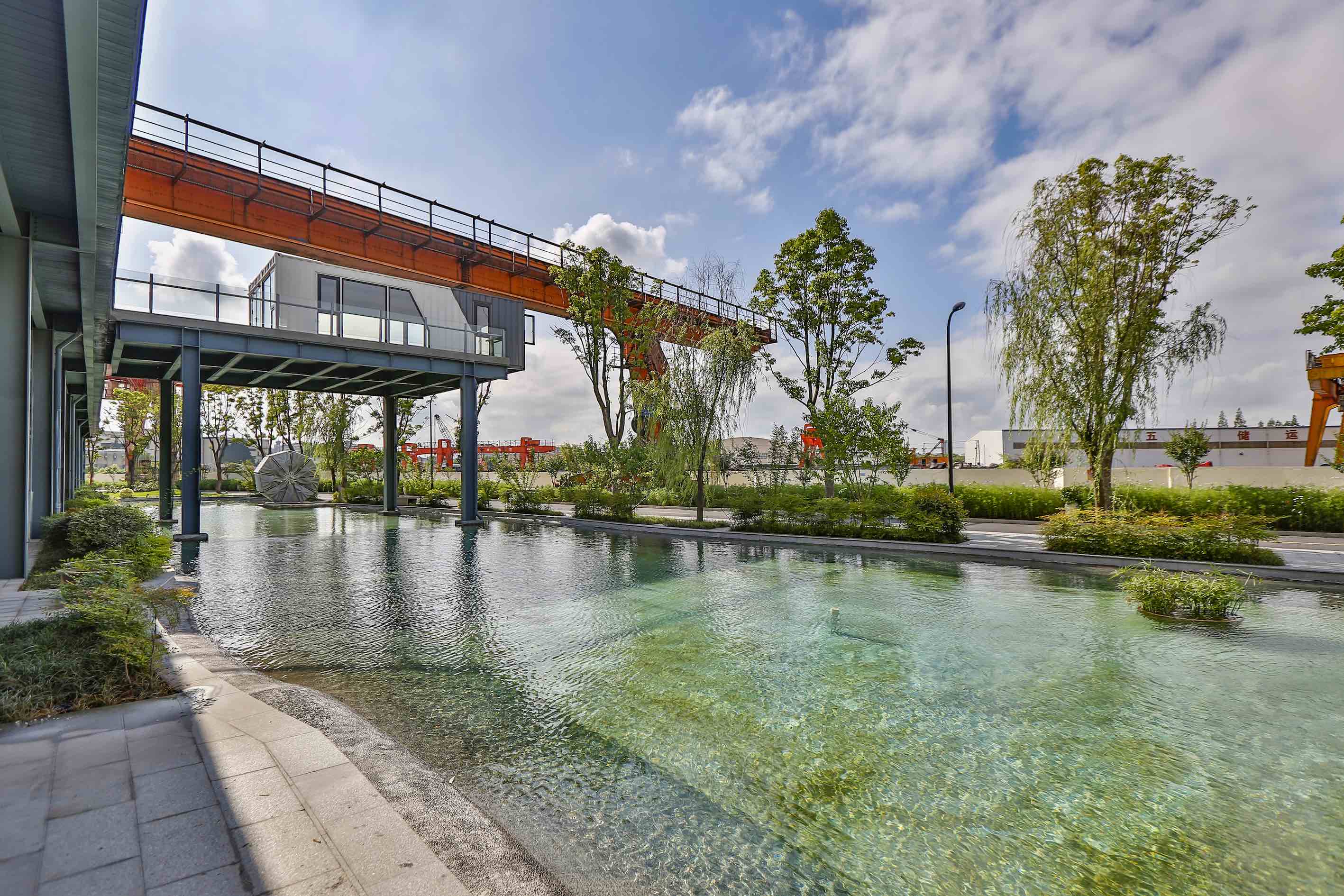 园区中部的星空高线公园保留了七个塔吊,由龙门吊和高架桥构成公园主体,可供游人驻足观赏河岸风光。