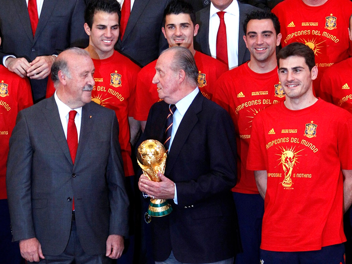 2010年,胡安·卡洛斯又在马德里王宫为刚刚夺得南非世界杯冠军的西班牙国家队颁奖。相同的场景还在两年后“斗牛士”再夺欧洲杯后出现,卡洛斯国王还将球衣拿出,向这些4年3夺世界大赛桂冠的英雄们索要签名。