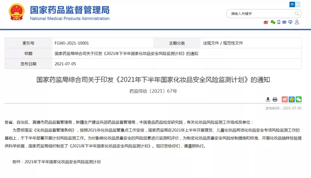 今日,国家药监局综合司发布《2021年下半年国家化妆品安全风险监测计划》的通知,全面扩大风险监测范围,明确下半年将监测1100批次,涵盖面膜、儿童化妆品等共18类化妆品,“网红”护肤类也首次出现在风险监测当中,足以见得监管不留死角的决心。