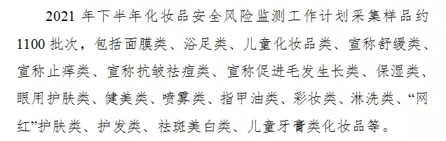 国家药监局在通知中指出,在2021年上半年开展育发、儿童化妆品两项化妆品安全专项风险监测工作的基础上,于下半年部署开展计划风险监测工作。根据规划,2021年下半年监管部门将重点监测面膜类、浴足类、儿童化妆品类、宣称舒缓类、宣称止痒类、宣称抗皱祛痘类、宣称促进毛发生长类、保湿类、眼用护肤类、健美类、喷雾类、指甲油类、彩妆类、淋洗类、“网红”护肤类、护发类、祛斑美白类、儿童牙膏类化妆品共18类化妆品,计划采集样品约1100批次。