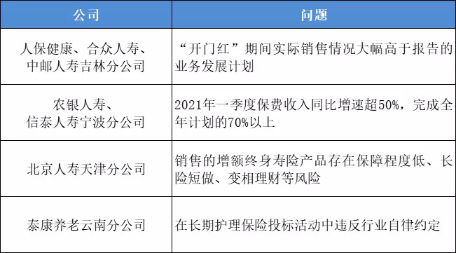 一是激进发展模式仍然存在。部分人身险公司仍然延续粗放经营模式,靠激励政策短期内获取业务规模高速增长。人保健康、合众人寿、中邮人寿吉林分公司“开门红”期间实际销售情况大幅高于报告的业务发展计划;农银人寿、信泰人寿宁波分公司2021年一季度保费收入同比增速超50%,完成全年计划的70%以上;北京人寿天津分公司销售的增额终身寿险产品存在保障程度低、长险短做、变相理财等风险;泰康养老云南分公司在长期护理保险投标活动中违反行业自律约定。
