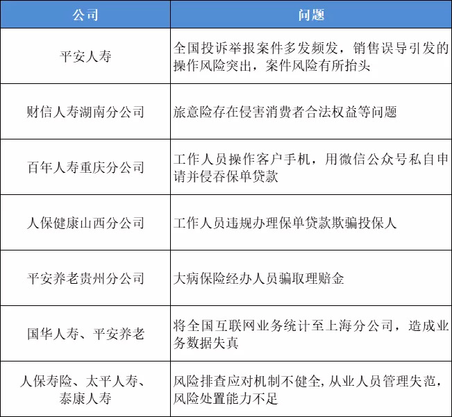 二是风险防控机制不健全。平安人寿全国投诉举报案件多发频发,销售误导引发的操作风险突出,案件风险有所抬头;财信人寿湖南分公司旅意险存在侵害消费者合法权益等问题;百年人寿重庆分公司工作人员操作客户手机,用微信公众号私自申请并侵吞保单贷款;人保健康山西分公司工作人员违规办理保单贷款欺骗投保人;平安养老贵州分公司大病保险经办人员骗取理赔金;国华人寿和平安养老将全国互联网业务统计至上海分公司,造成业务数据失真;人保寿险、太平人寿、泰康人寿风险排查应对机制不健全,从业人员管理失范,风险处置能力不足。