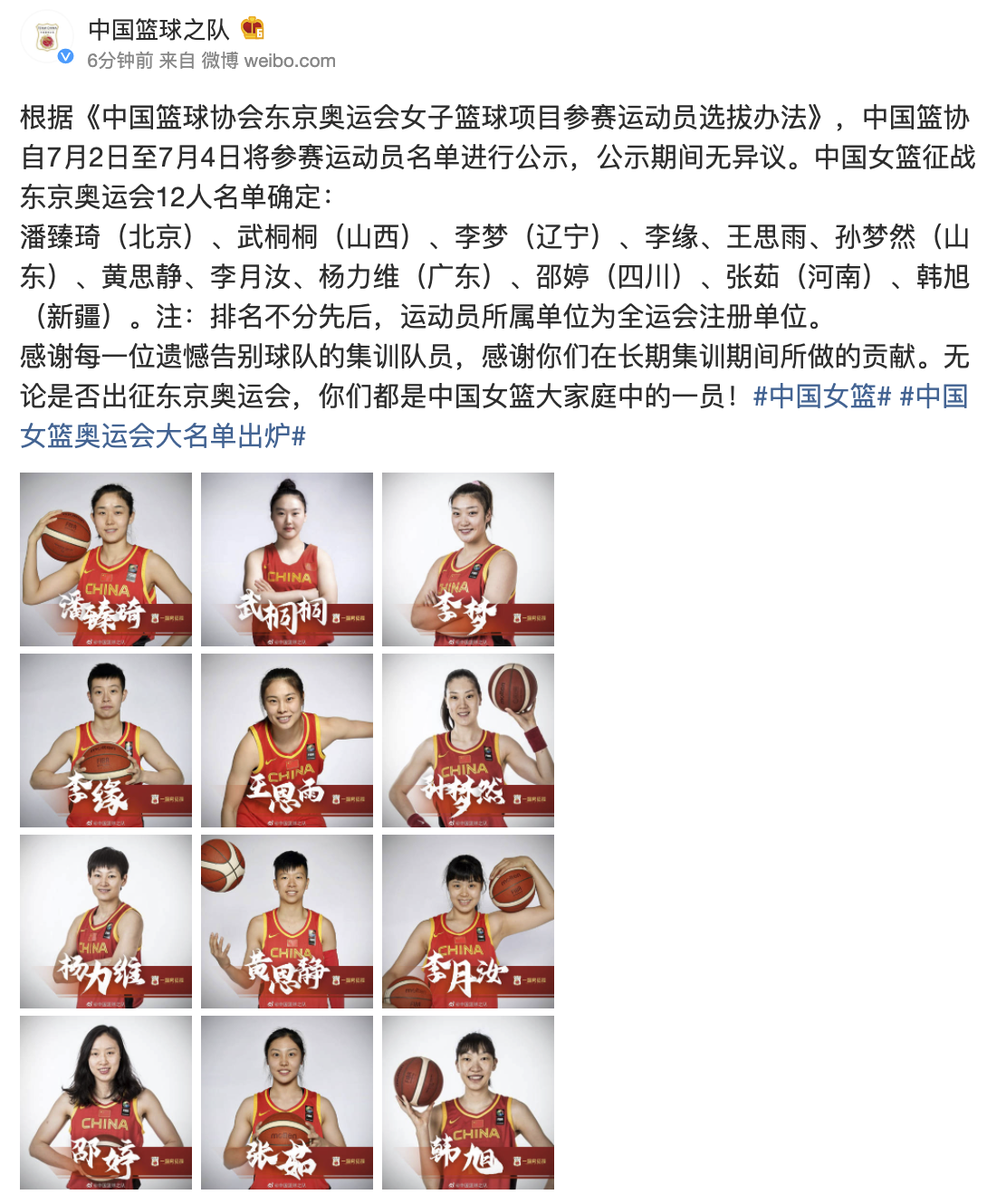 @中国篮球之队 微博7月5日消息,根据《中国篮球协会东京奥运会女子篮球项目参赛运动员选拔办法》,中国篮协自7月2日至7月4日将参赛运动员名单进行公示,公示期间无异议。中国女篮征战东京奥运会12人名单确定:潘臻琦(北京)、武桐桐(山西)、李梦(辽宁)、李缘、王思雨、孙梦然(山东)、黄思静、李月汝、杨力维(广东)、邵婷(四川)、张茹(河南)、韩旭(新疆)。