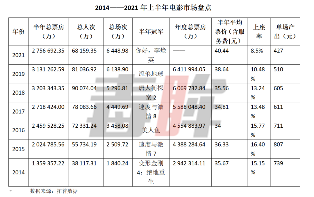 上半年大盘的多项数据都出现了下滑的趋势。大盘的275.67亿较2018、2019年同期缩水不少,与2017年同期的271.84亿元基本持平,而2017年同期的平均票价是34.81元,今年则是40.44元。