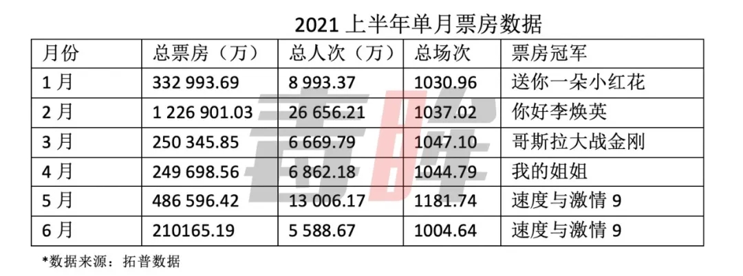 与2019年同期相比,2021年前6个月仅有2月和5月的单月票房实现了小幅上涨,而1、3、4、6这四个月的票房都是下滑的。其中3、4、6月这三个月,单月票房都不到26亿,与2019年同期的40亿+相比,下滑幅度在40%—50%左右。