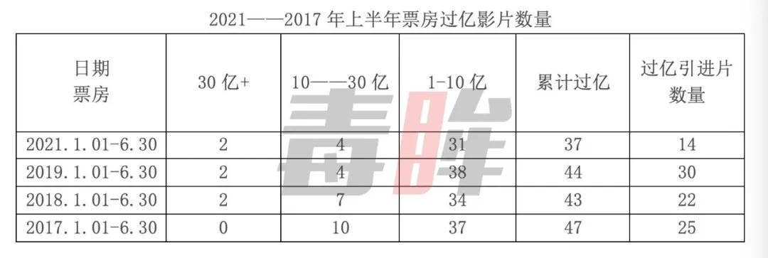 2021年上半年累计票房过亿的影片共37部,比2019年同期少了7部;票房在10亿—30亿区间的影片有4部,与2019年同期相当;票房在1亿—10亿区间的影片,今年上半年有31部,也比2019年同期少了7部——中腰部影片的表现不及去年同期,仅依靠两部大爆款,是无法挽回观众的。