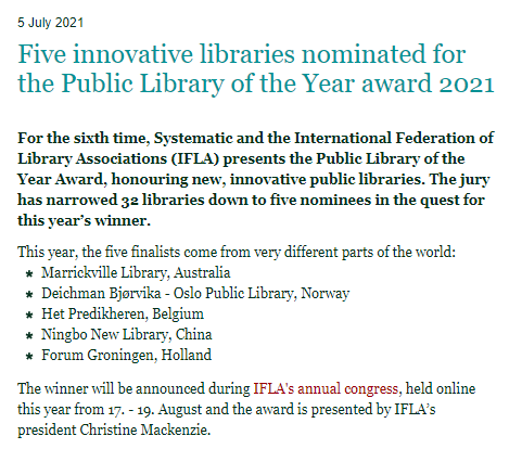 与宁波图书馆一同入围的还有澳大利亚的Marrickville图书馆,挪威的Oslo公共图书馆、比利时的Het Predikheren、以及荷兰的Forum Groningen。这五家图书馆将在8月17日至19日的世界图书馆与信息大会(World Library and Information Congress,简称为WLIC)上做线上展示。IFLA也将在会上公布最终获奖的公共图书馆名单。