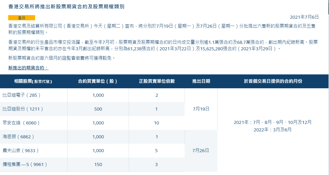 据港交所官网7月6日消息,港交所将分别于7月19日(星期一)及7月26日(星期一)分批推出六只新的股票期货合约及五只新的股票期权类别,其中包括比亚迪电子、海底捞、携程集团、农夫山泉等。