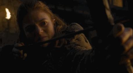 耶哥蕊特多次试图射杀雪诺,未果,反而被后方一个小毛孩,射箭偷袭成功。