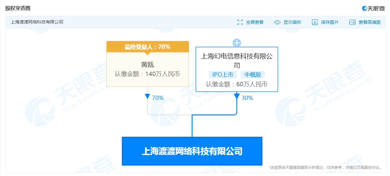 据天眼查APP显示,7月6日,上海渡渡网络科技有限公司成立,法定代表人为黄瓯,注册资本200万人民币,经营范围包括软件开发,软件销售,娱乐性展览等。股东信息显示,该公司由黄瓯、B站关联公司上海幻电信息科技有限公司共同持股,持股比例分别为70%、30%。