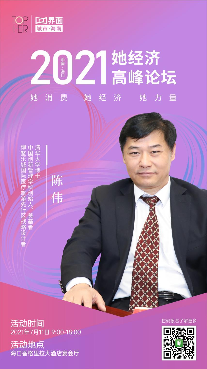 博鳌乐城国际医疗旅游先行区战略设计者、中国创新管理学科创始人、清华大学博士陈伟将出席7月11日由海南省妇女联合会指导,界面新闻海南频道、中国女性财经媒体TOPHER、海南自贸区一号财经文化传播有限公司主办,FM100海南交通广播《声动早班车》栏目承办,海南三乐数字媒体有限公司独家户外媒体支持的“2021她经济高峰论坛”并作主旨演讲。