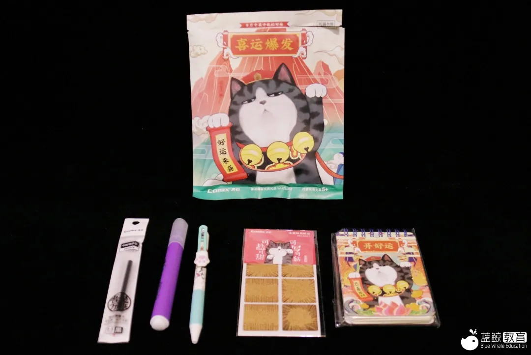 齐心与吾皇万睡联名的这款盲袋,我们开出了五种文具。包括一支0.5mm按动式黑色中性笔,一支同款替芯,一支紫色荧光笔,一本A7规格80页的双螺旋装订记事本,以及一张木质标签贴纸。与其包装上标明的产品种类相比,缺少了一卷胶带。