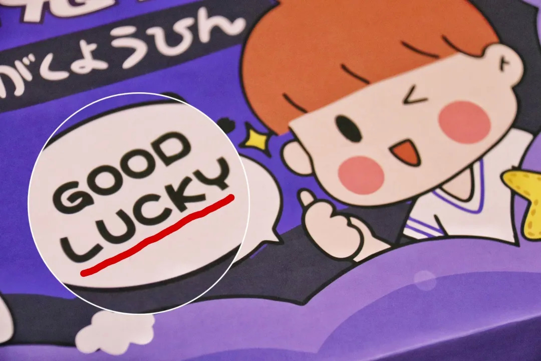 让人没想到的是,这款盲盒外包装上竟然出现了汉语错别字、英文语法错误,侧边的“幸运指数”被印成“幸远指数”,正面的“GOOD LUCK”被印作“GOOD LUCKY”,着实让人质疑这个盲盒的正规性。