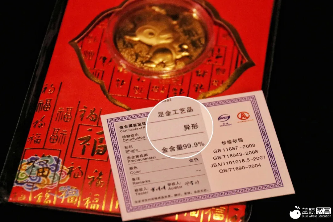 在这款盲盒中,出现了一块“金箔”,附带的贵金属鉴定证书上写着“国家级检验中心”、“国家金银制品质量监督检验中心”字样,检验结论为“足金工艺品”,金含量更是高达99.9%。