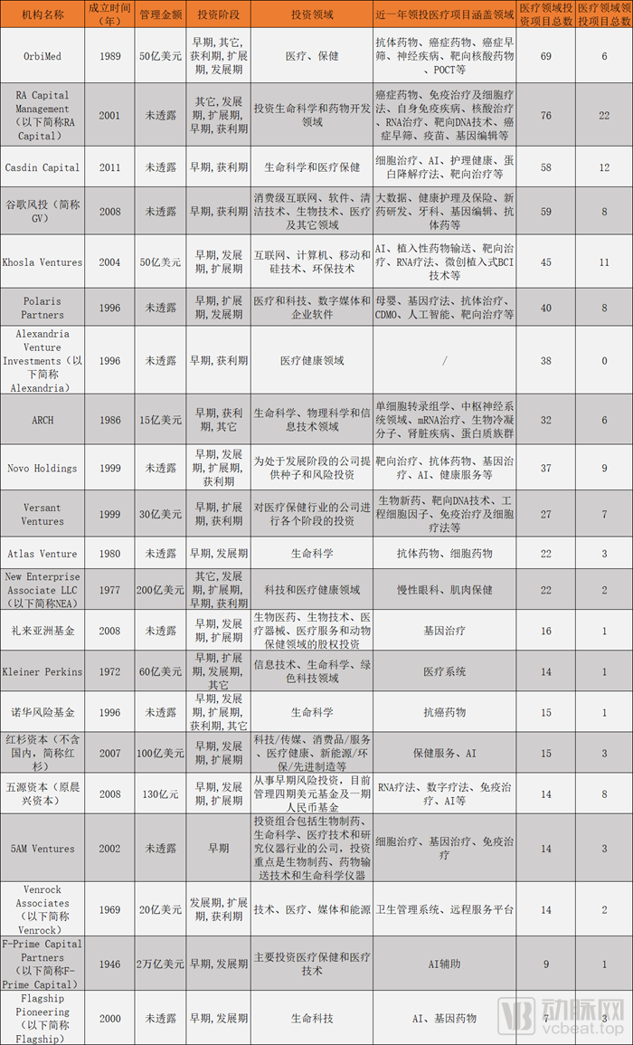 其中,综合性投资机构有10家(包括GV、NEA、Venrock、Kleiner Perkins、红杉、ARCH、Khosla Ventures、Polaris Partners、Novo Holdings、五源资本),投资范围涵盖不同领域、各个阶段和各个地区的互联网、软件、清洁技术、生物技术、医疗、媒体和能源等;