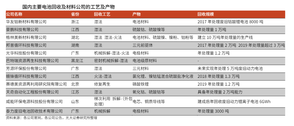 据光大证券统计,国内主要动力电池回收企业共有12家,主要技术路线为湿法。其中,北京赛德美以磷酸铁锂修复再生为技术路线,衢州华友、哈尔滨巴特瑞、山东威能生产电池原材料,其余均为三元材料的生产。