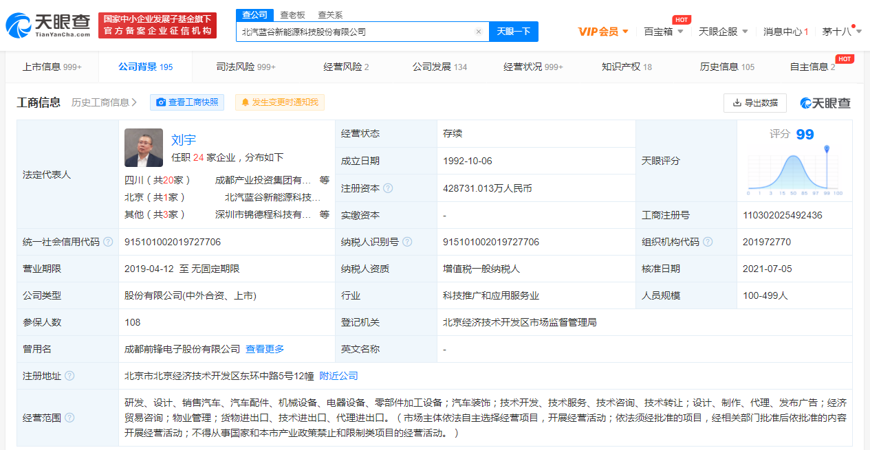 据天眼查APP显示,近日,北汽蓝谷新能源科技股份有限公司发生工商变更,注册资本由约34.94亿人民币增至约42.87亿人民币,增幅超22%。北汽蓝谷新能源科技股份有限公司成立于1992年10月,法定代表人为刘宇,经营范围包括研发、设计、销售汽车、汽车配件、机械设备、电器设备、零部件加工设备等。