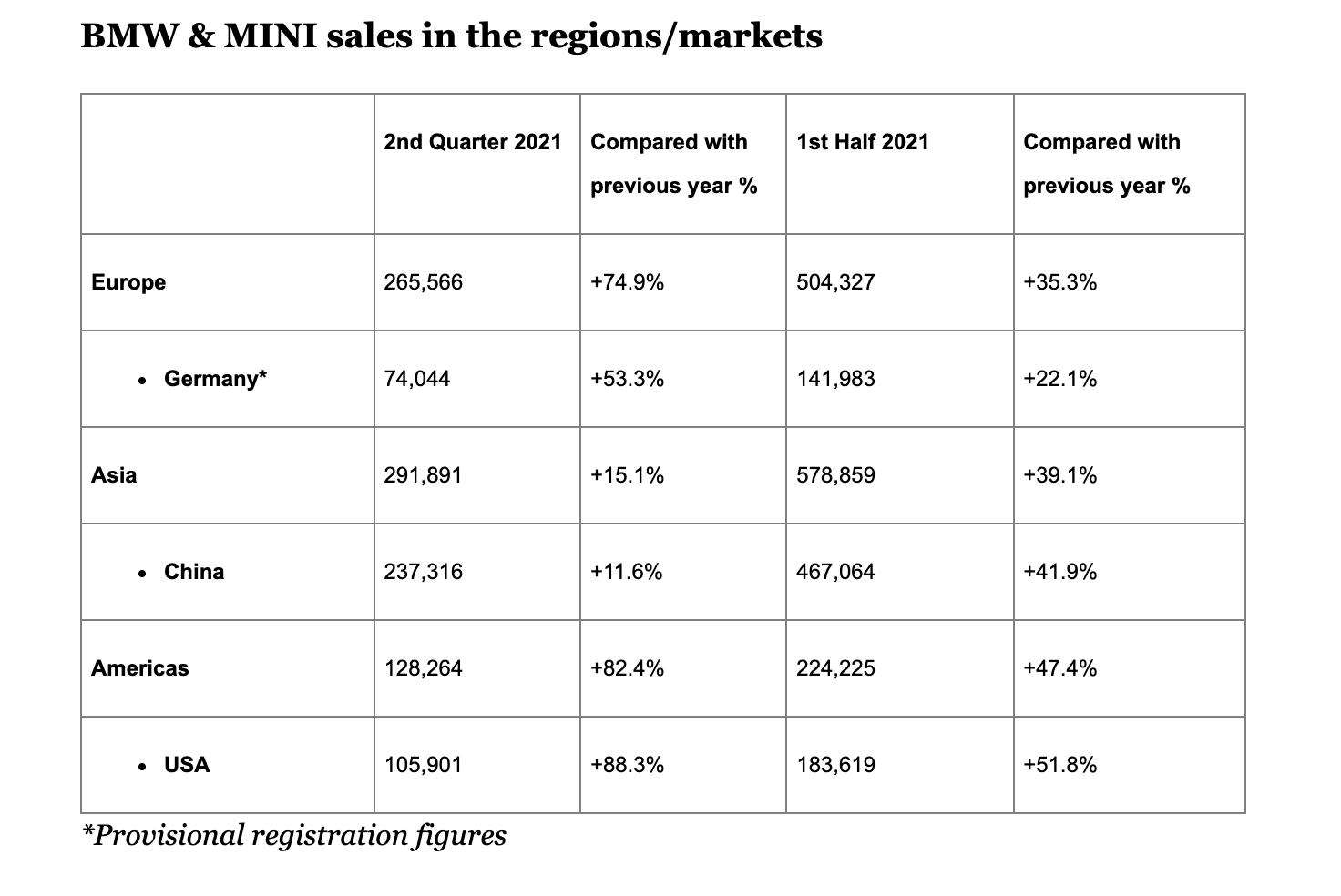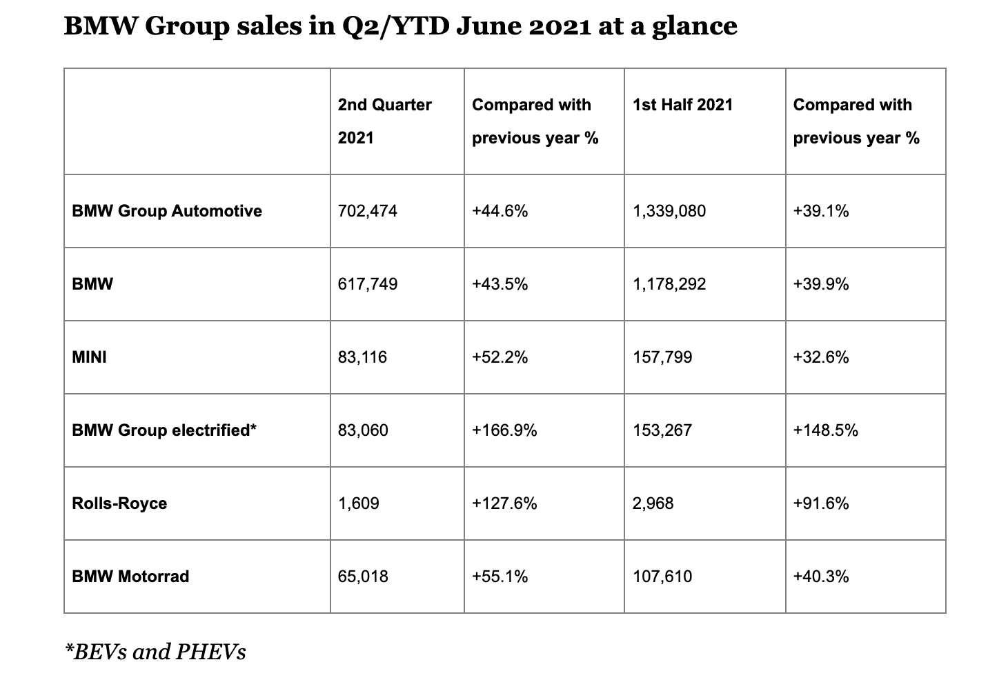 7月7日,德国高档汽车制造商宝马宣布,2021年上半年集团(包括宝马、MINI和劳斯莱斯三大品牌)共向客户交付了1,339,080辆汽车,同比增长+39.1%,销量创下历史新高。所有品牌在今年前六个月的销量都有所增长,公司在全球所有地区的销量都有所增长。