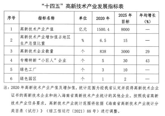 《规划》提出,“十四五”时期高新技术产业发展的主要目标是到2025年,海南高新技术产业取得跨越式发展,有力支撑海南“三区一中心”和自由贸易港建设,其中高新技术产业产值突破8000亿元,新型工业产值突破4000亿元,数字经济产业营业收入达到 4000亿元;高新技术企业数量达3000个;全社会研发经费投入强度达到1.6%;打造10家绿色工厂和2个绿色园区,“最多跑一次”事项占比超过95%。