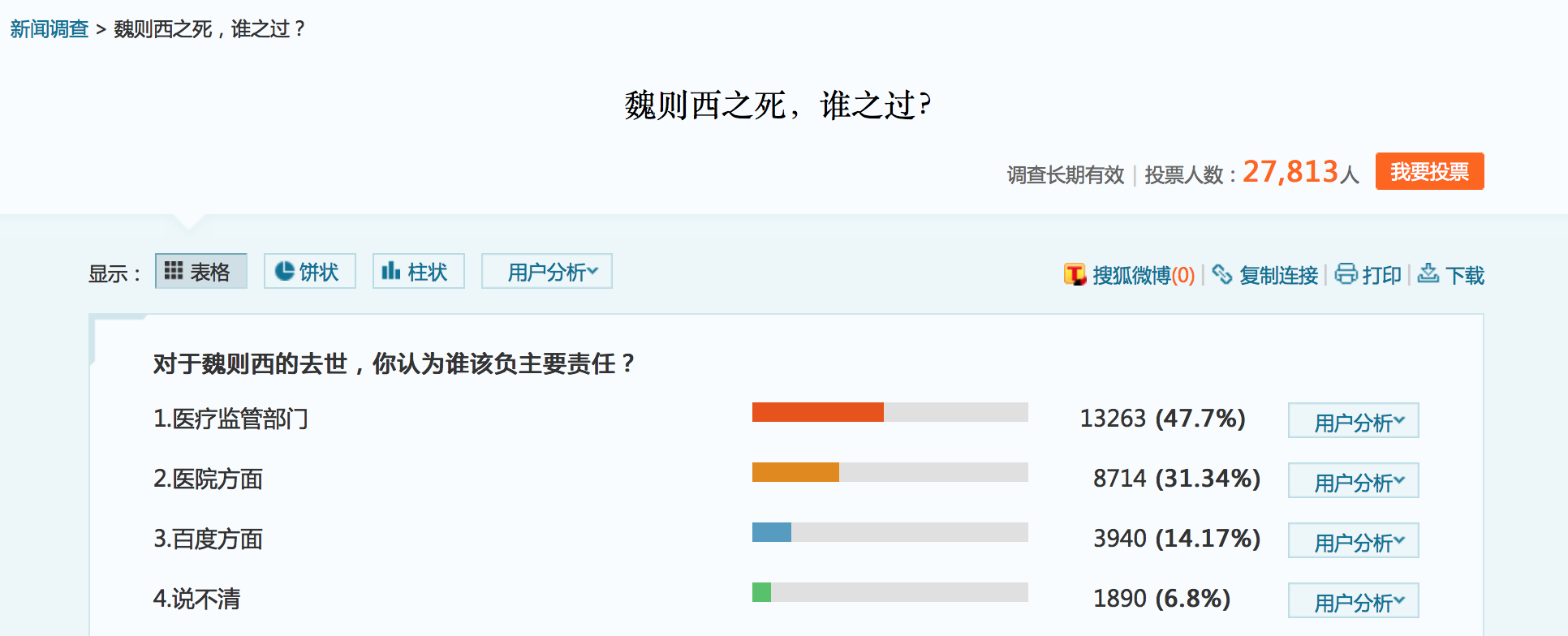 5月2日,搜狐网发出了一篇重点文章《起底调查:引发公愤的医院科室背后是莆田系身影》,指出“乱象源于部队医院不归卫计委管理“,文中设置的问则更代表了大多数人的声音:近一半网友认为,医疗监管部门应该对魏则西的去世负主要责任,医院方则为近3成,认为作为信息推广平台的百度则不到15%。
