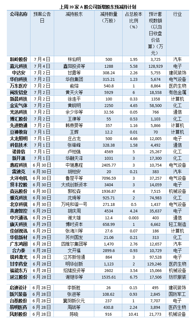 上周(6月28日至7月4日),据界面新闻不完全统计,共有39家A股公司披露股东预减持计划。